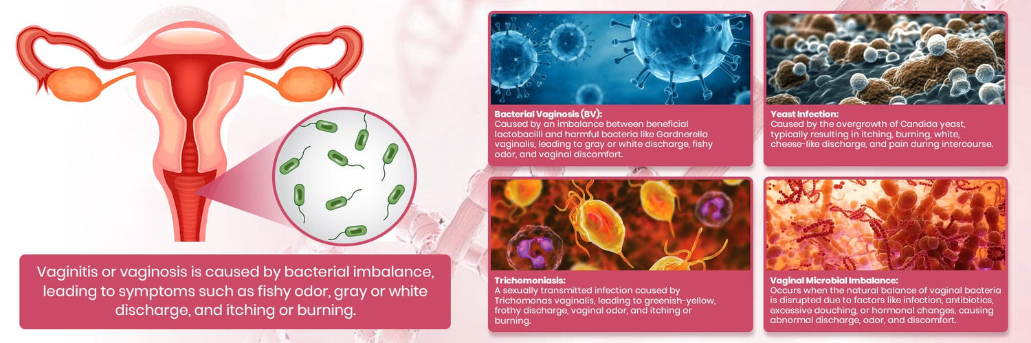 Vaginitis is often caused by factors such as bacterial imbalance, sexually transmitted infections, weakened immunity, hormonal changes, poor hygiene habits, and medication use. Common types of vaginitis include Bacterial Vaginosis (BV), Yeast Infection (Candidiasis), Trichomoniasis, and others.